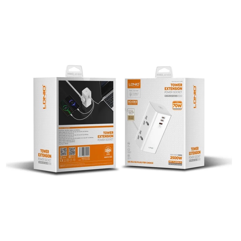 چندراهی برق الدینیو مدل SC4383 یک ایستگاه شارژ رومیزی و چندراهی برق ۷۰ واتی است که طراحی جمعوجور و امکانات متنوعی دارد. این محصول ترکیبی هوشمندانه از پریز برق یونیورسال و پورتهای شارژ سریع است که نیاز کاربران روزمره و حرفهای را به شکل هوشمندانهای برآورده میکند.